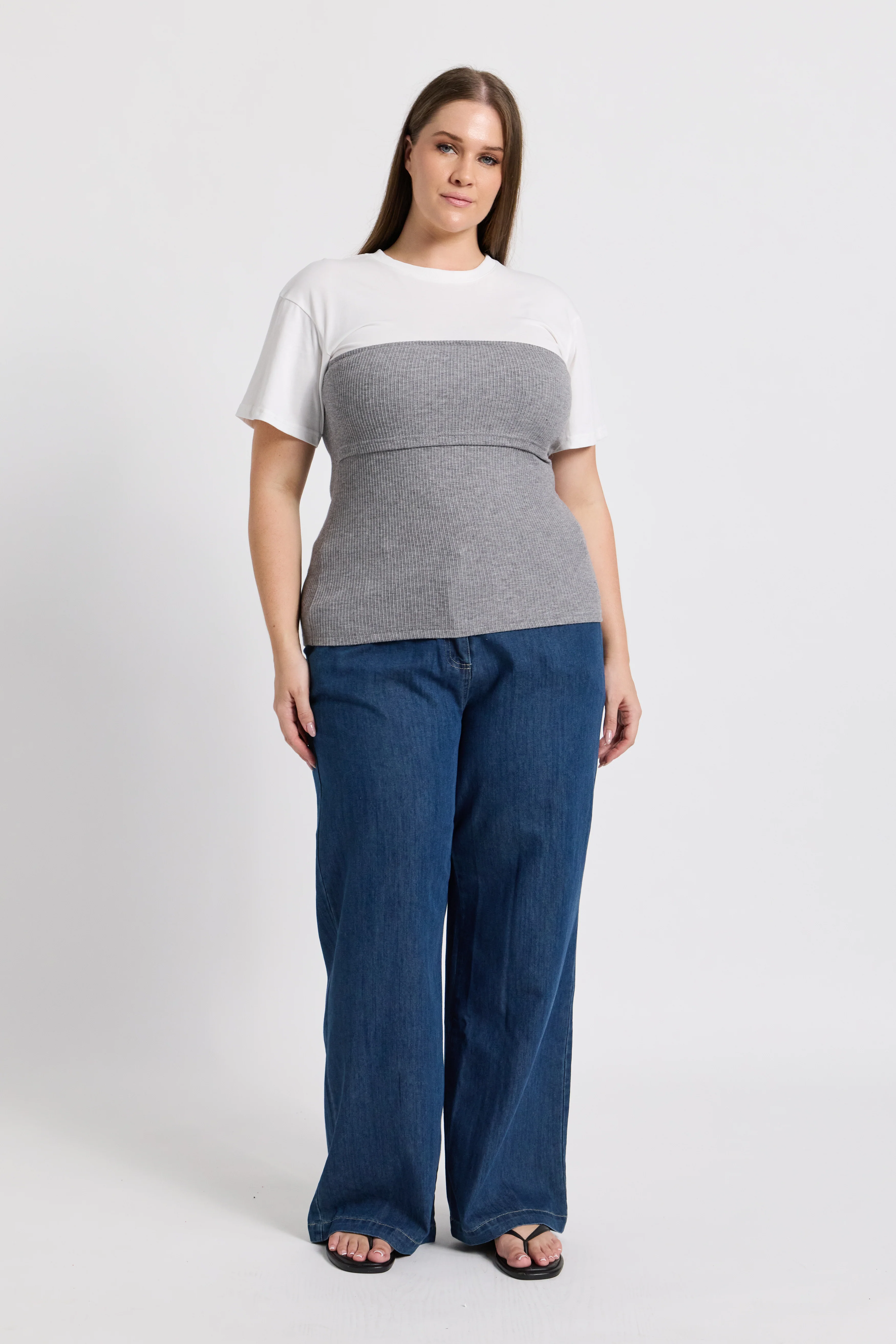 Cleo Ribbed Bodice Tee - White / Grey Marle