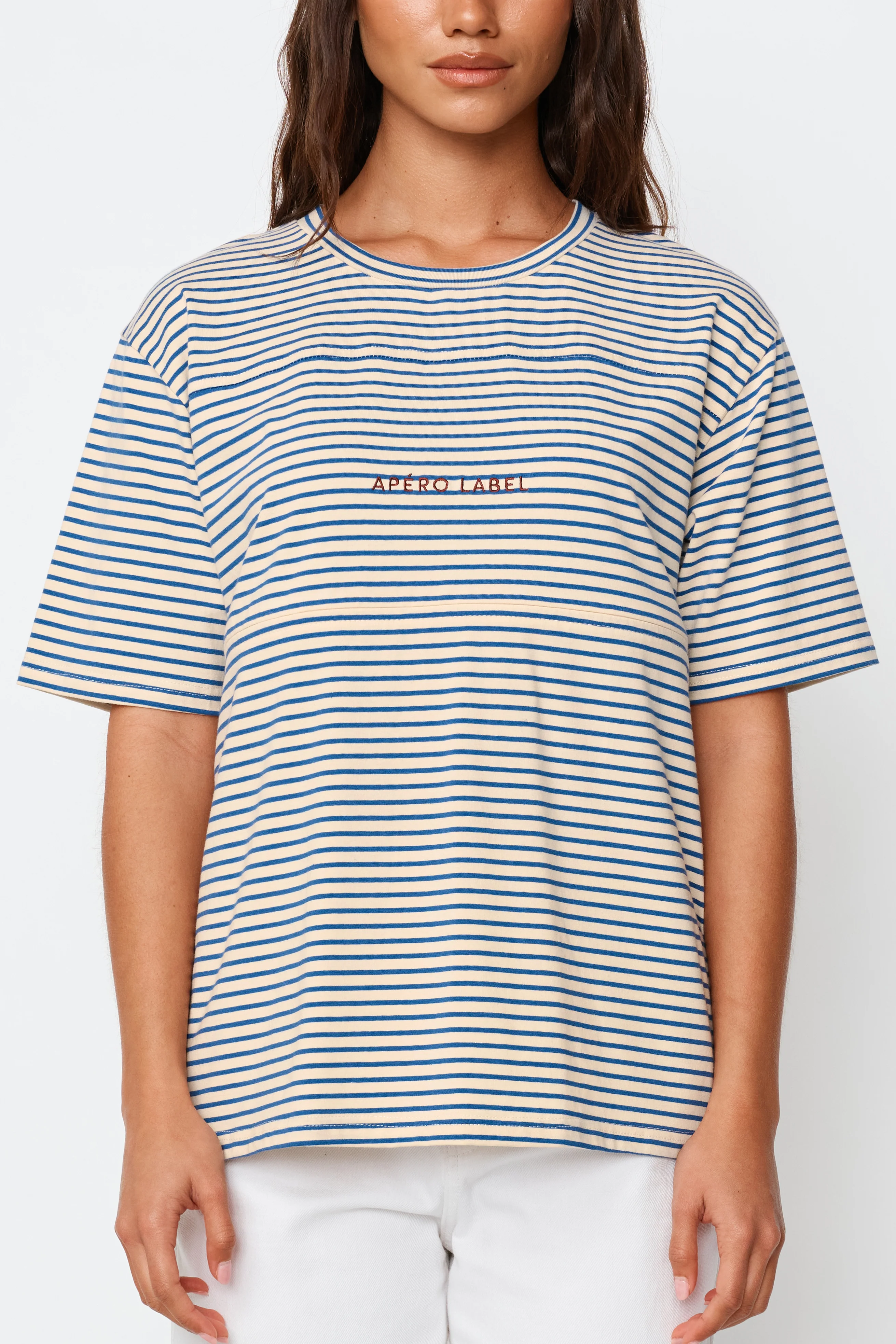 Designed with a relaxed boyfriend fit, this slip-on tee is made from soft cotton jersey and boasts a timeless cream base adorned with narrow cobalt blue stripes throughout. A touch of elegance comes from the mulberry-brown embroidered ApĂ©ro Label text on the front. With a round neckline and short sleeves, this tee is the perfect blend of comfort, practicality, and chic design.Â