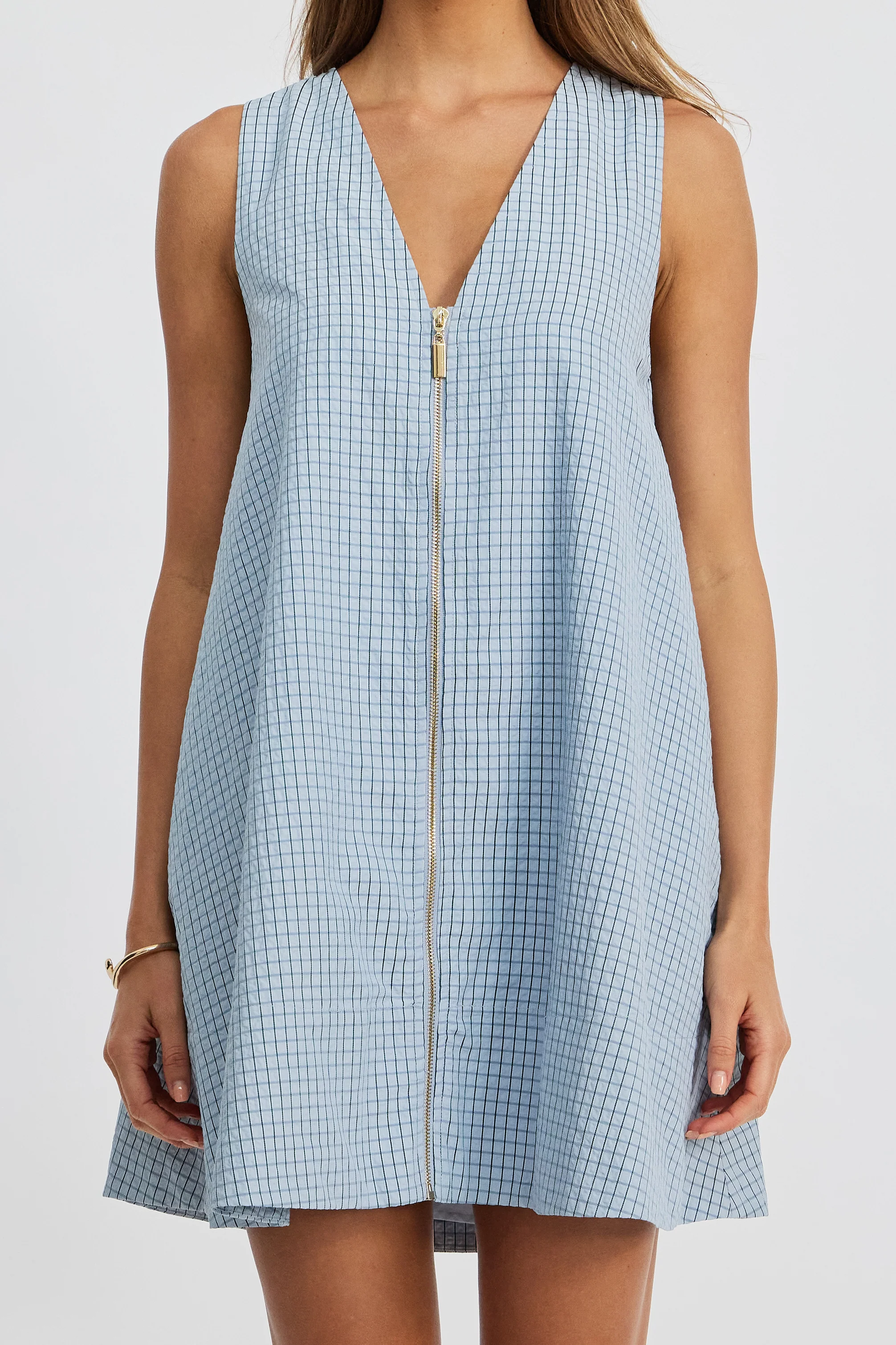 Available in fresh Apple Green and cool Blue, the Lettie Zip-Front Mini Dress will be on high rotation all summer long, perfect for picnics, brunches, and days spent in the sun.
