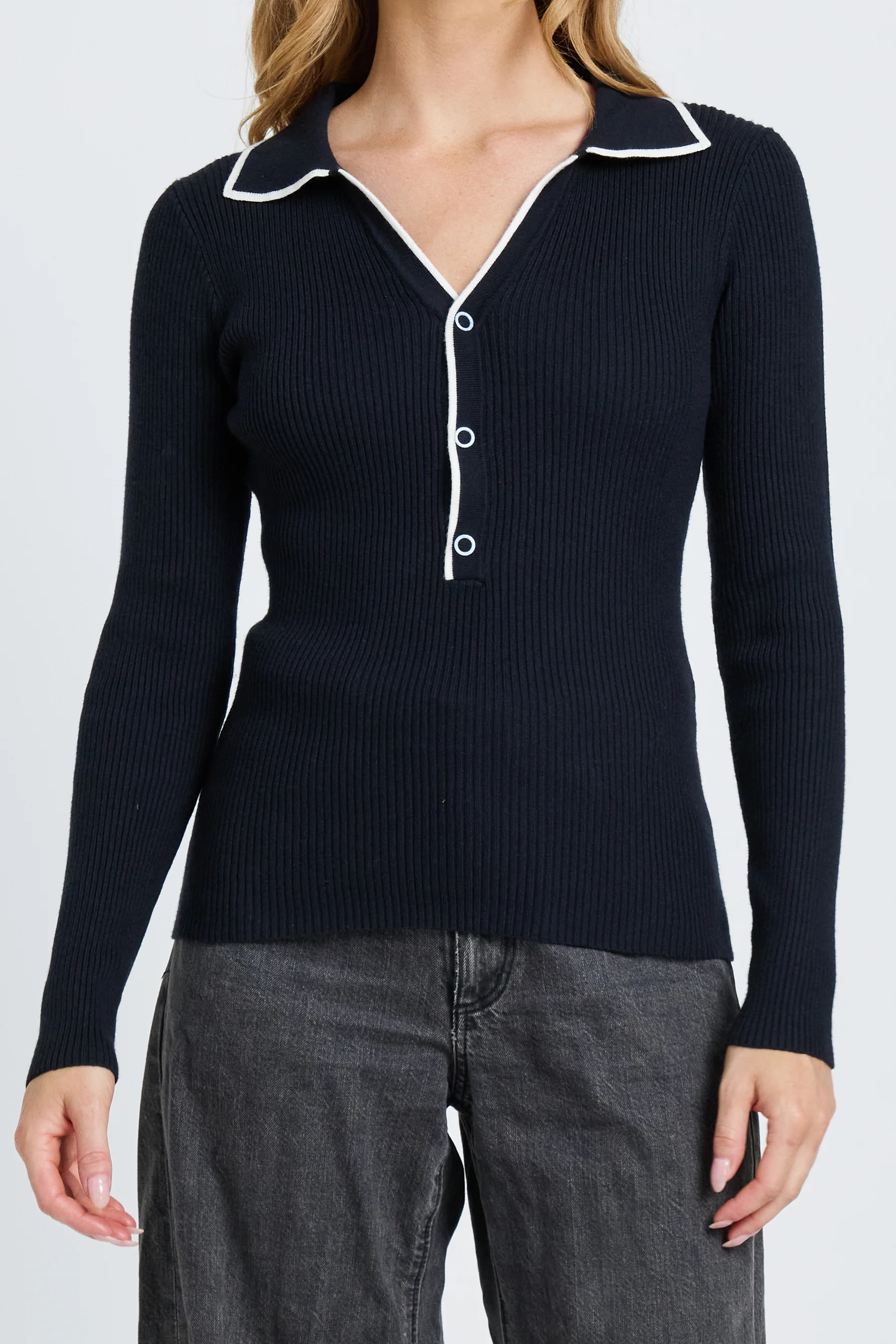 Crafted from a soft, stretchy rib knit, it moves with you through every stage. The polo style neckline and crisp white contrast trim adds a refined, modern touch, while the long fitted sleeves enhance its sleek silhouette.
