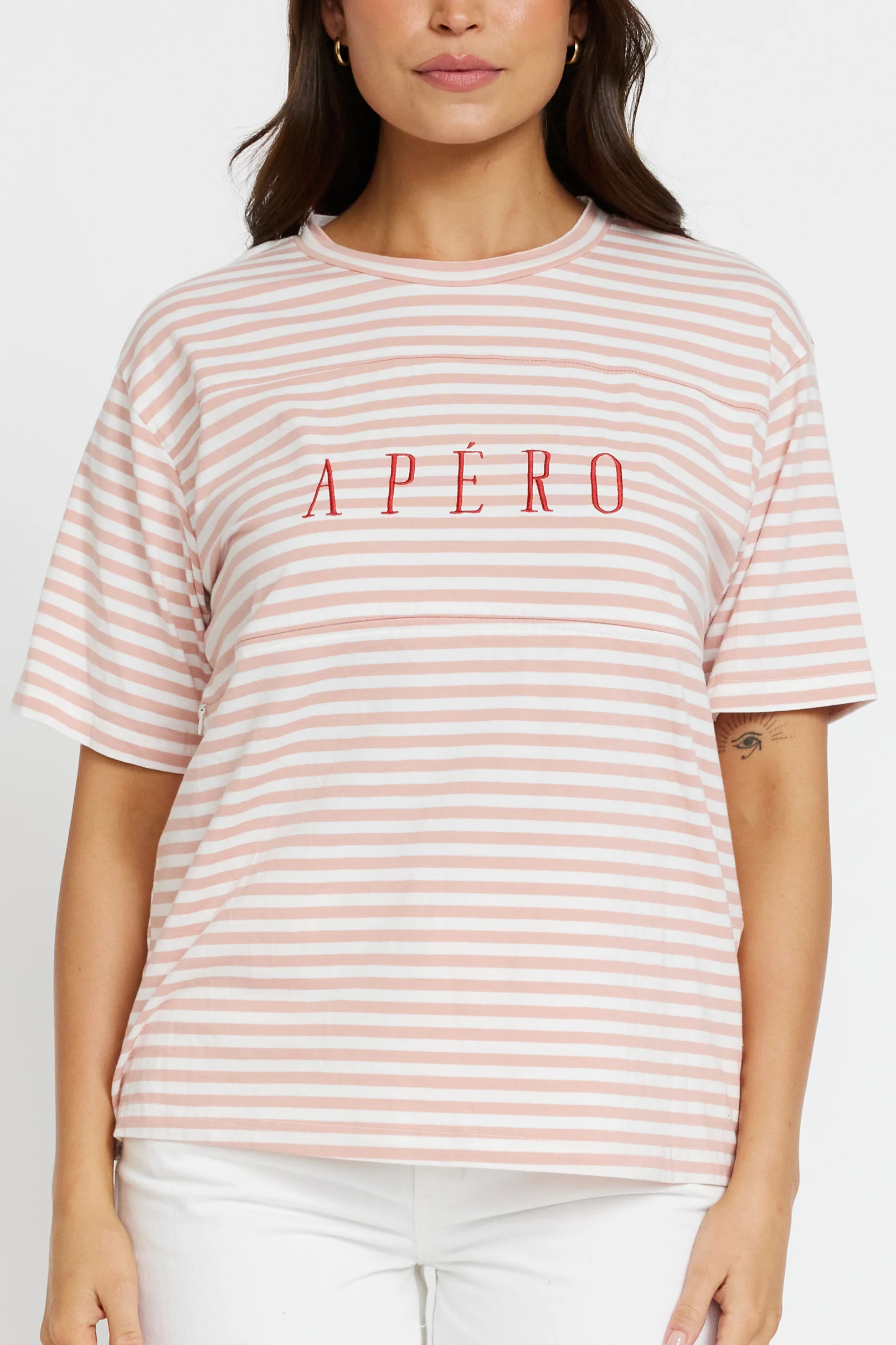 Discover the Riviera Stripe Panel Tee. Designed in a pink and white stripe cotton fabric with a red embroidered ApƩro logo on the front. The classic, relaxed fit tee with full sleeves and a round neckline allows the Riviera Tee to be the perfect wardrobe staple, but with a fun pop of colour. Style with your go-to jeans and sneakers for an effortlessly chic look.