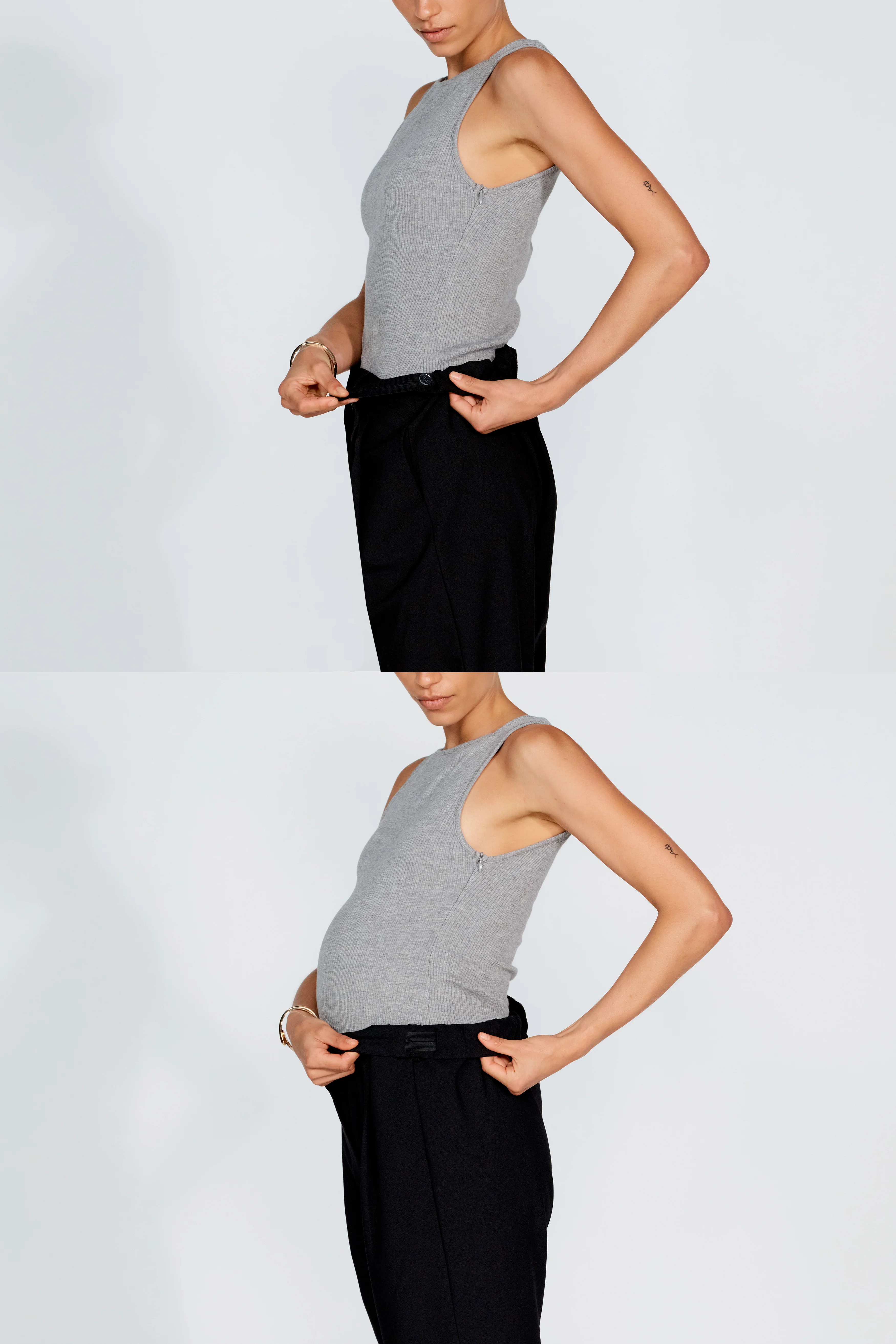 Sadieās revolutionary design allows the waist to increase up to four times larger than your usual size, whilst maintaining a true to size fit through the hip and leg. On the inside of the pants are two adjustable bands with button holes and a hidden elastic at the back waistband to allow for a comfortable fit and adjustment.