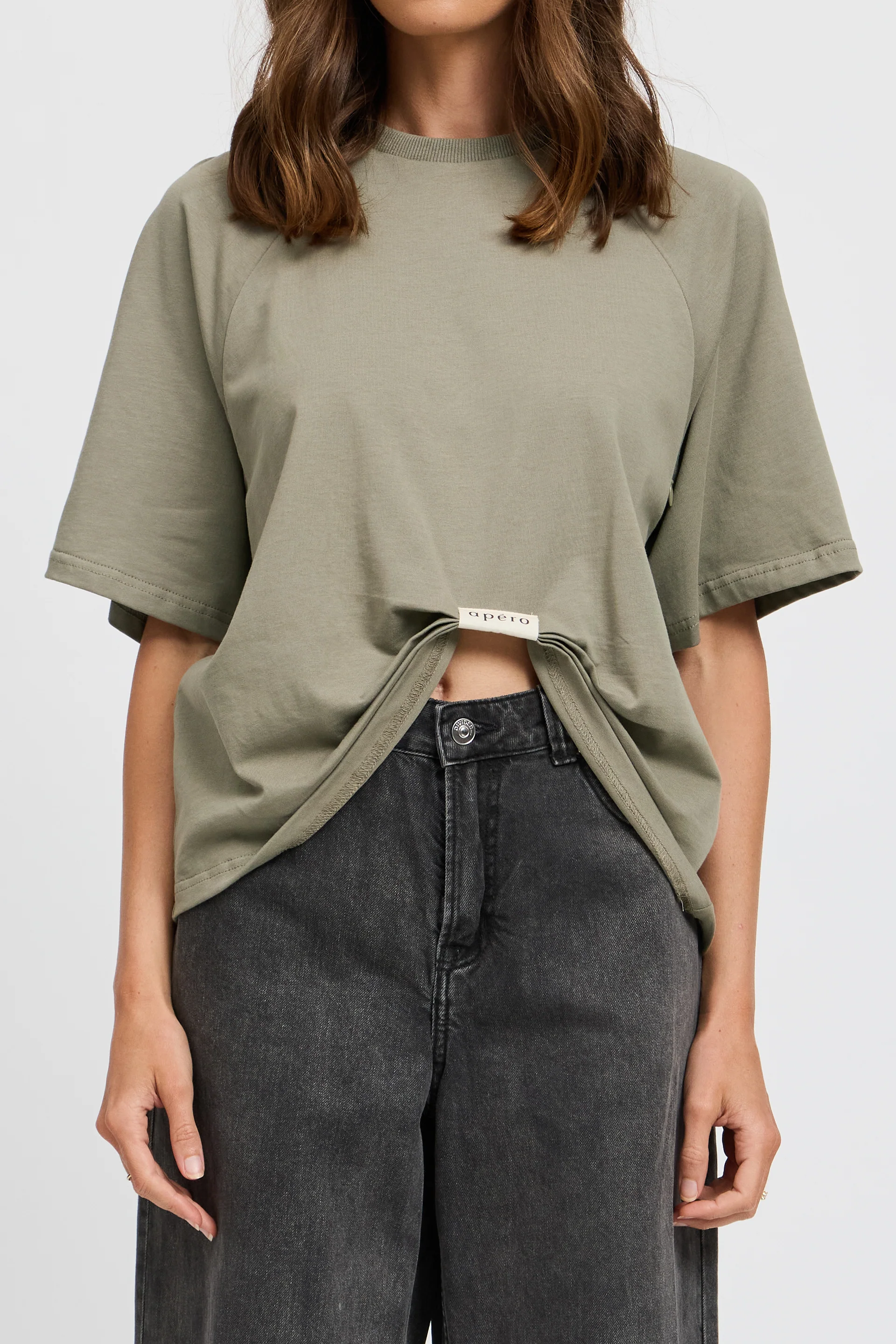 Crafted with invisible zippers discreetly positioned along the front bias armholes, it offers effortless and comfortable breastfeeding access. A unique off-centre Apéro canvas tag gathers the front hemline to create a natural ruched effect, allowing the tee to sit neatly at the waist without the need to tuck in. This detail also ensures the tee stays in place above a growing bump, delivering a flattering fit throughout pregnancy and beyond.
