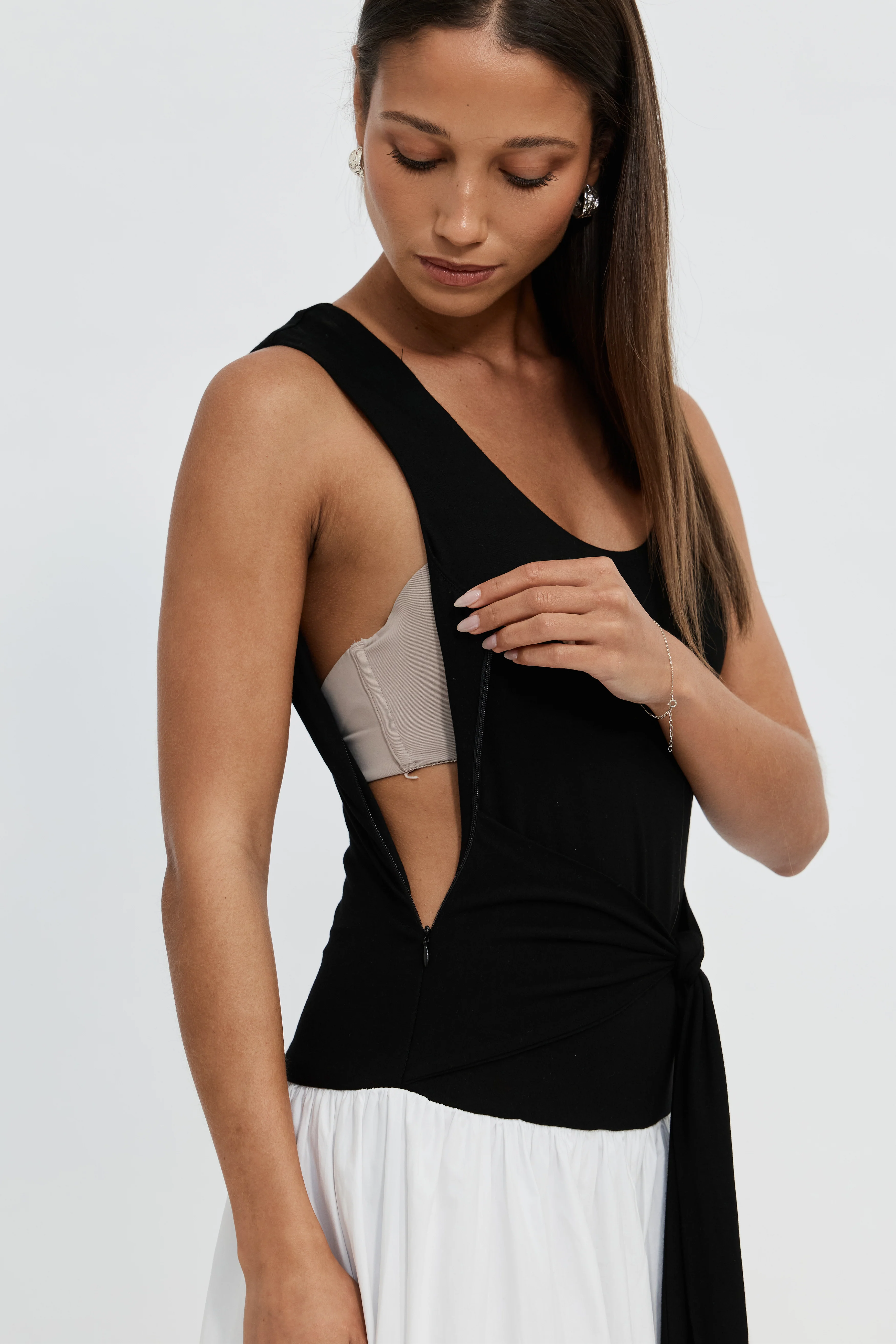 The Shelbie Combination Drop-Waist Midi Dress in Black/White combines modern design with thoughtful functionality for maternity and beyond. Crafted with a fitted bodice in stretchy black jersey and a full, gathered white cotton poplin skirt, it features a dropped waistline and asymmetric tie panels at the sides to cinch the waist and add visual interest.