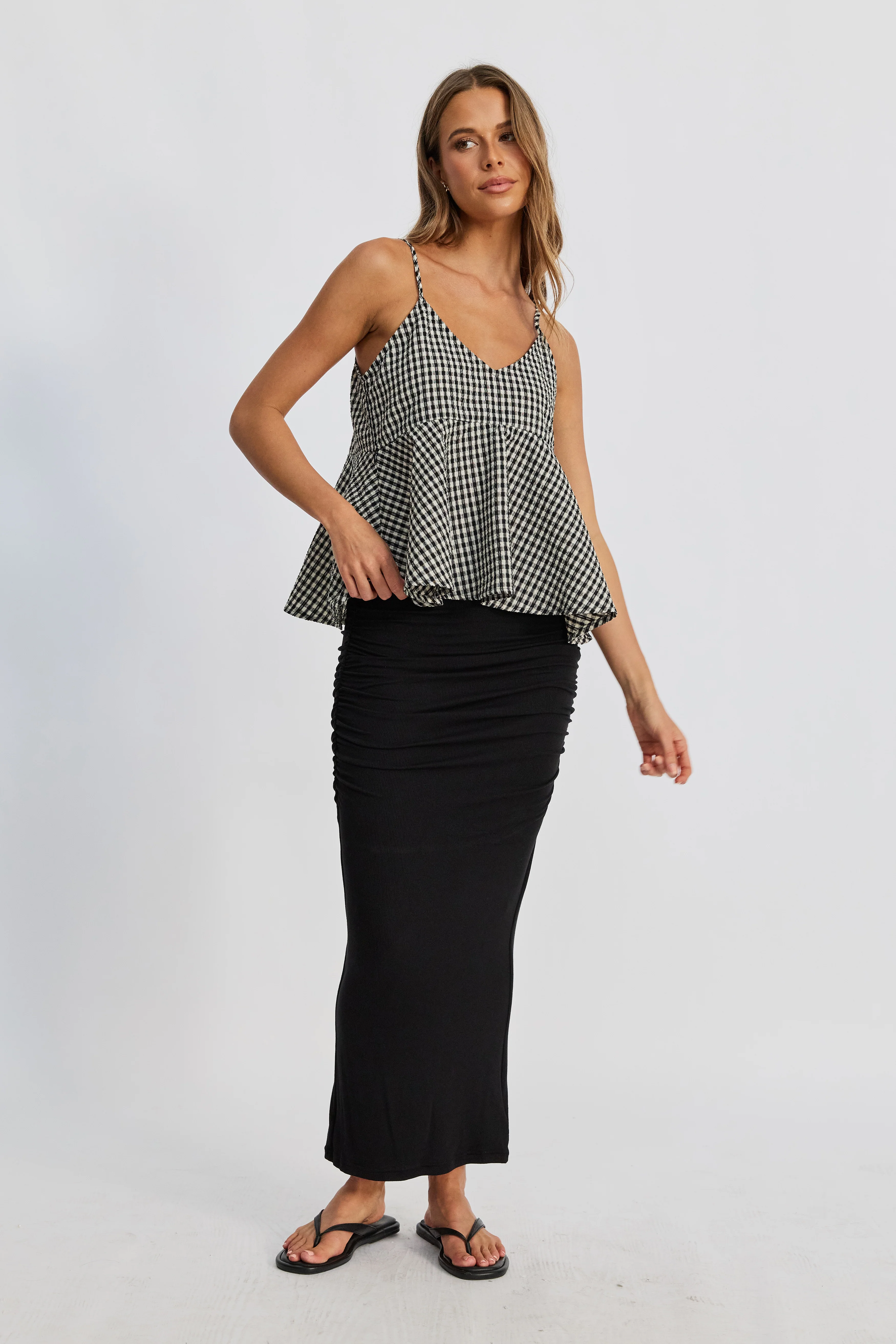 Thoughtfully designed for nursing, a two-way invisible zipper hidden in the front underbust seam provides discreet breastfeeding access, and the relaxed frill shape allows room to grow over a bump. The top layer is rendered in woven black-and-white gingham seersucker with a V-neckline and adjustable spaghetti straps, while the tee layer is crafted from soft black cotton jersey with a ribbed crew neckline and rolled cap sleeves, offering both comfort and ease.